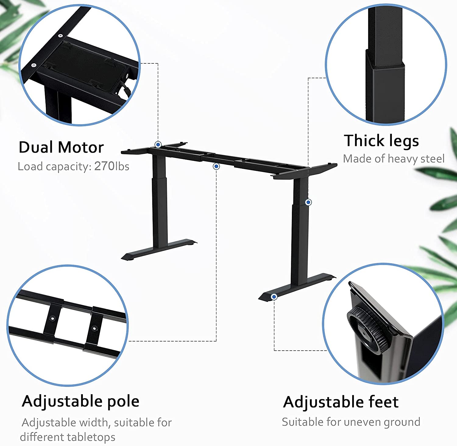 DUAL MOTOR DESIGN - The adjustable height desk features two motors, which implement smoother, more steady, quieter movement than single motor. Constructed with T-shape steel frame,it can competitively support up to 220lbs.