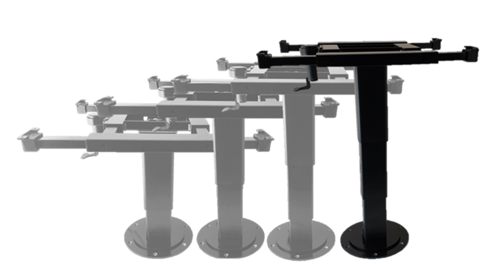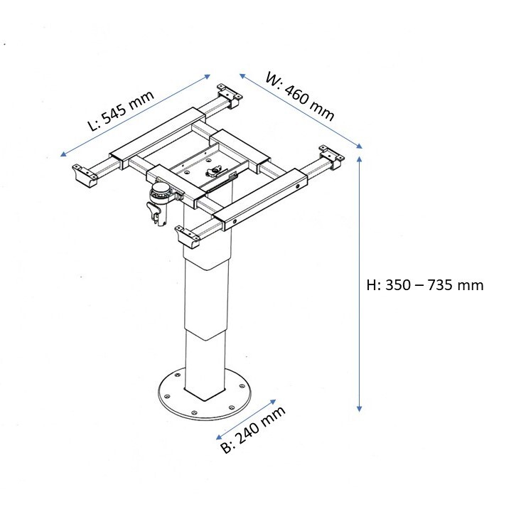 This table leg is designed to be bolted to the floor of your RV and attach a table top (not supplied) to the top bracket. It is fully adjustable from the top bracket sliding left to right and backwards to forwards as well as the whole body being able to spin on the spot once installed. Unlike similar products on the market, this table can be adjusted at any height between 350mm – 735mm by simply using the easy function hand operated paddle